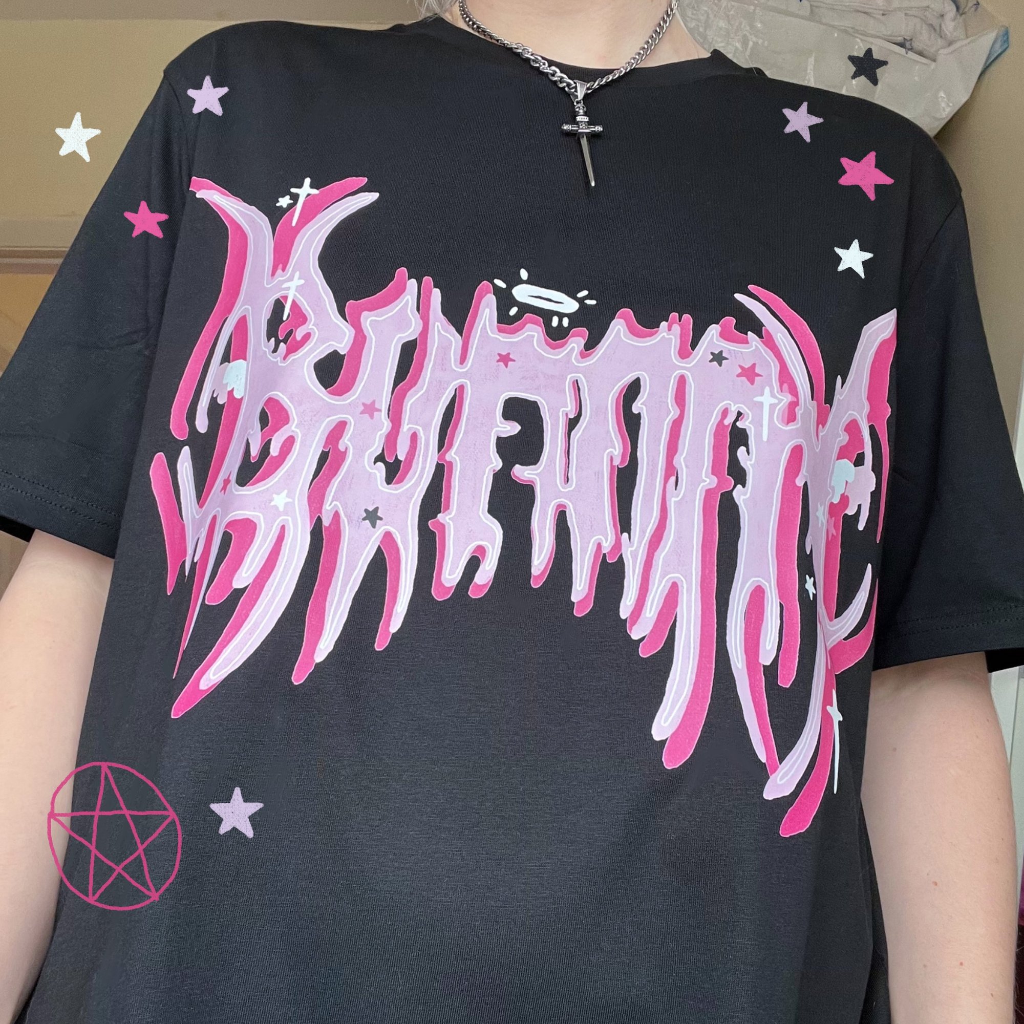 The tee is a soft spun tee that is vegan approved and organic. There is a large print on the front, and large wing print on the back.
