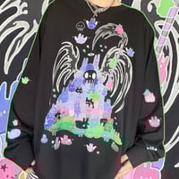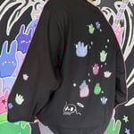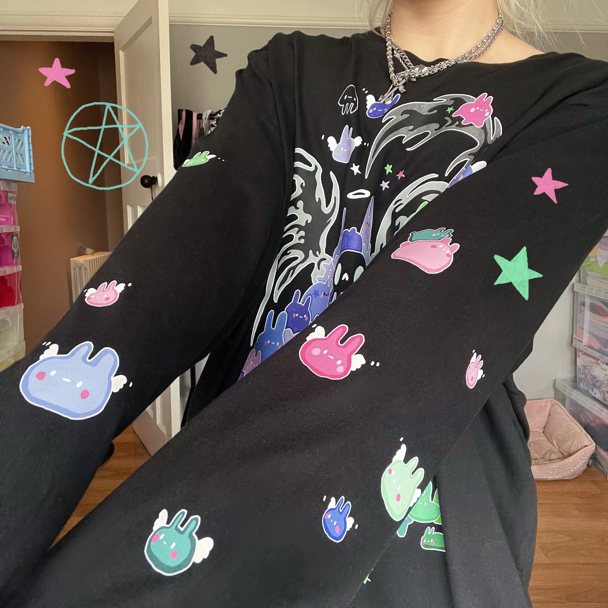 The longsleeve tee is vegan approved, organic and heavyweight, 240gsm. There is a large print on the front, and little bunnies on the back and up the sleeves. This is drawn, designed and printed by me at home.