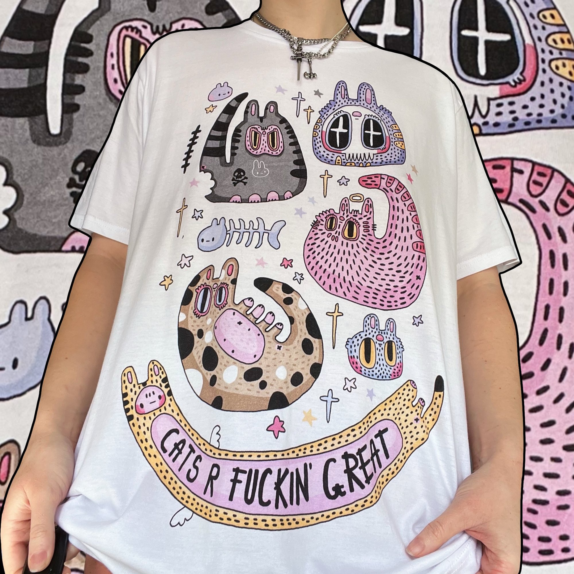 The tee is a soft spun tee that is vegan approved and organic. There is a large print on the front, and little browncurly cat on the back!