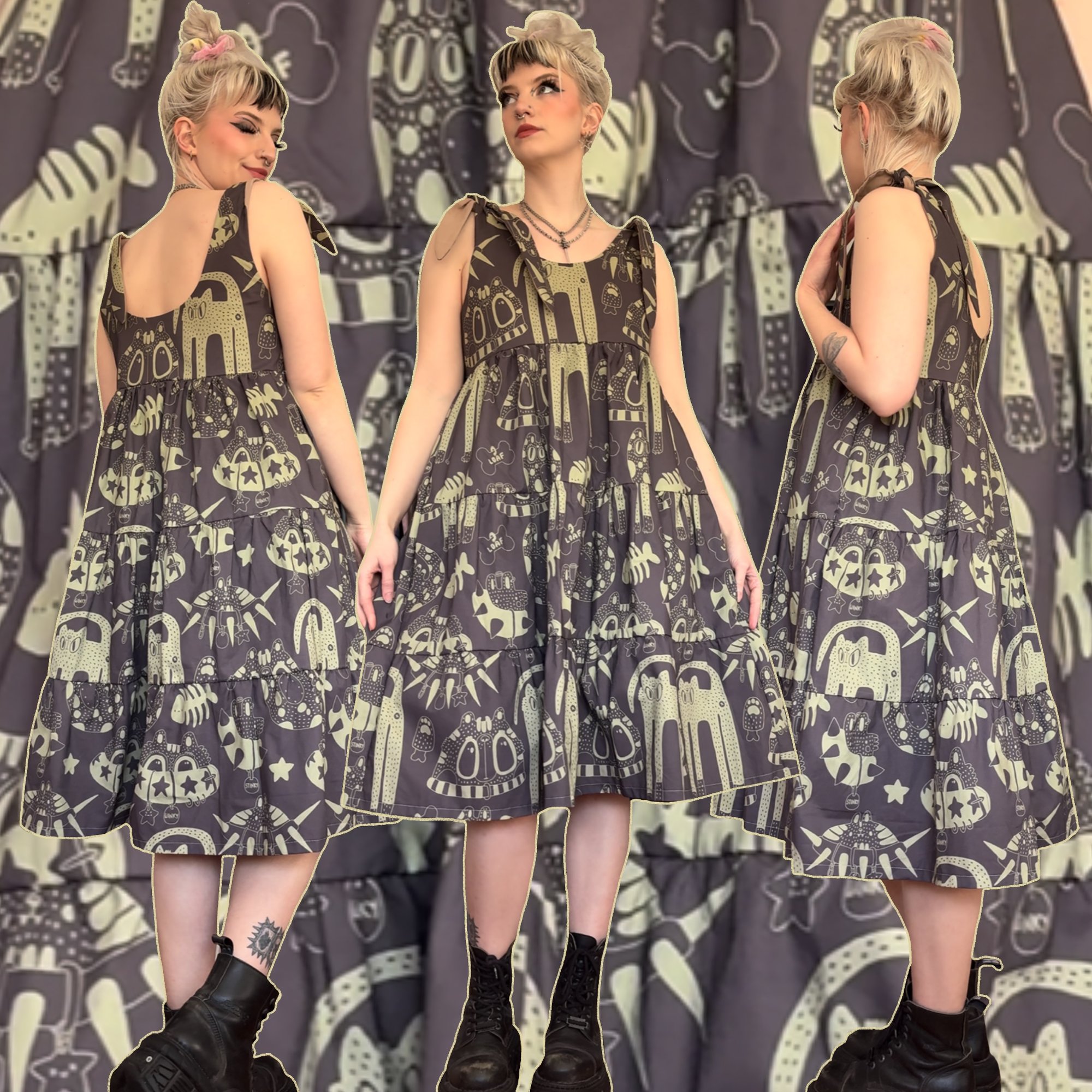 -All dresses are made by me, in my home studio, with true love and passion for sustainably made alternative fashion. I only order fabric for orders after they come in, so I limit the amount of waste as much as possible.
