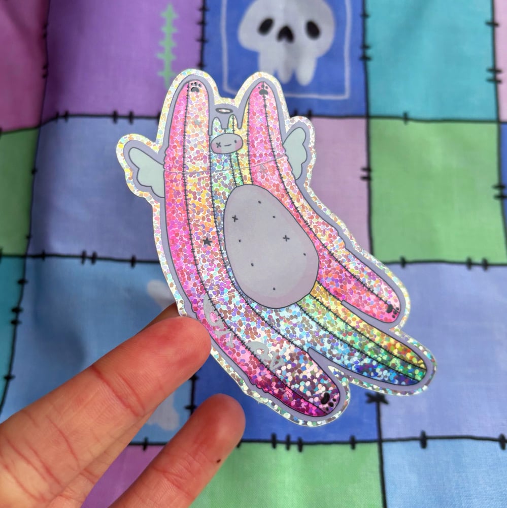 A glossy finish vinyl of a fun rainbow flying friend. Roughly measures 6.5cm x 9cm.