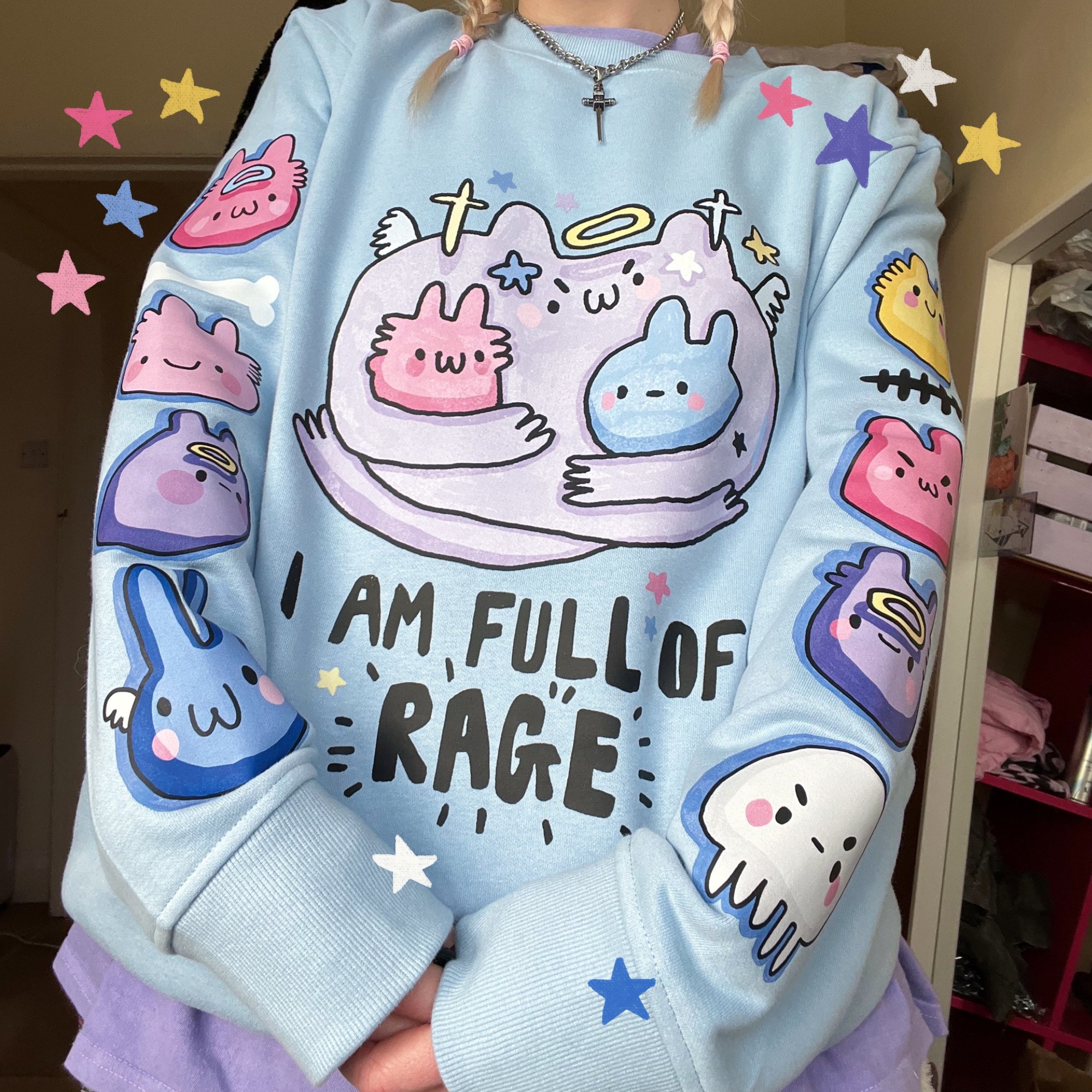Convey those feels so no one tests u lol. This sweater is fully designed and printed by me at home. The base is an organic, heavy weight, super soft baby blue sweater with thick ribbing base and cuffs.