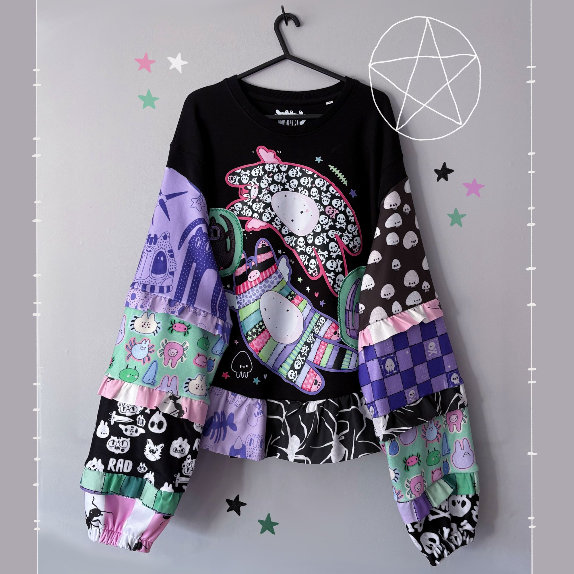 A flying spooky friends piece with frilly fleecy arms. All front and back pieces are fully designed by me! Including the spooky patches machine sewed on the front.