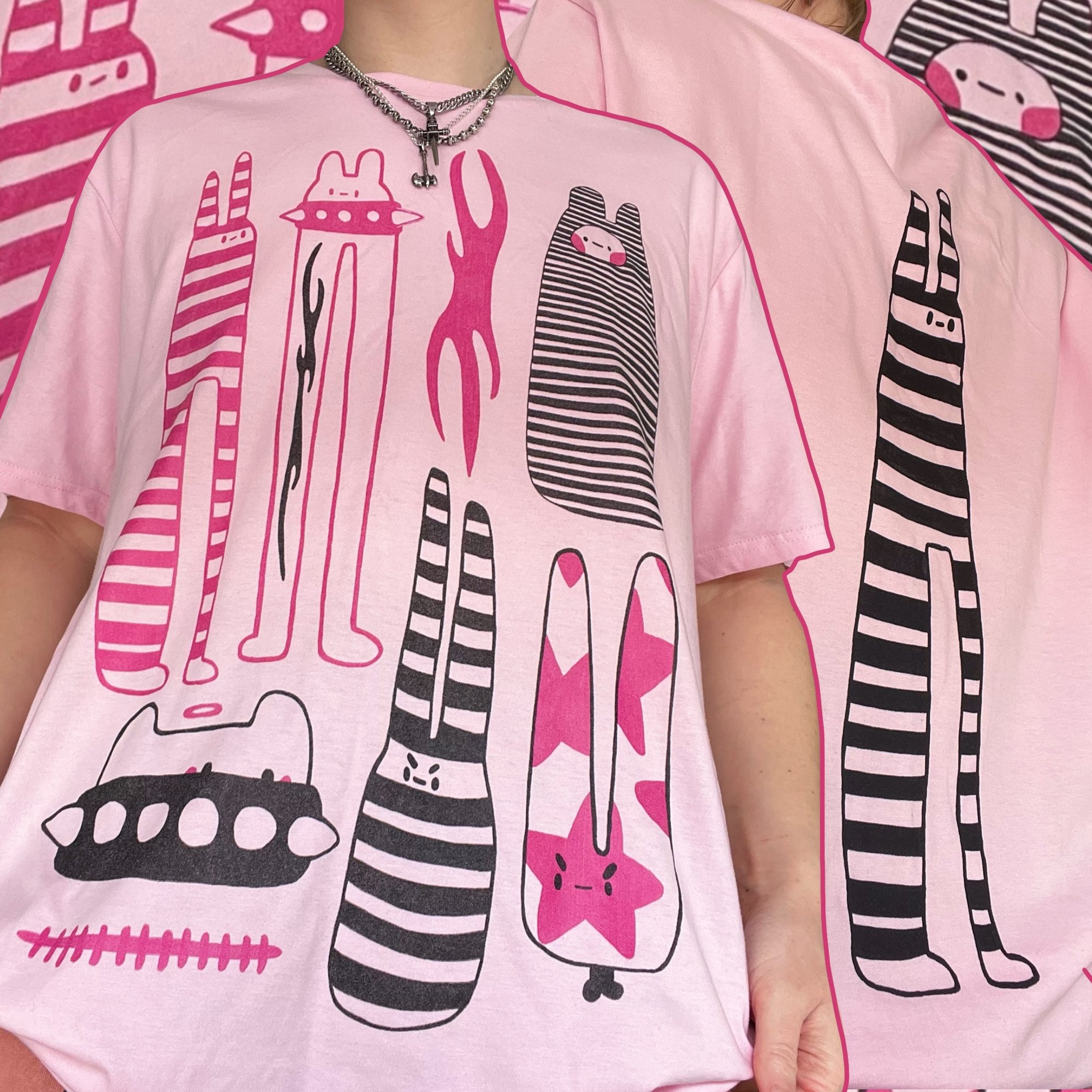 The tee is a soft spun tee that is vegan approved and organic. There is a large print on the front, and long boy on the back.